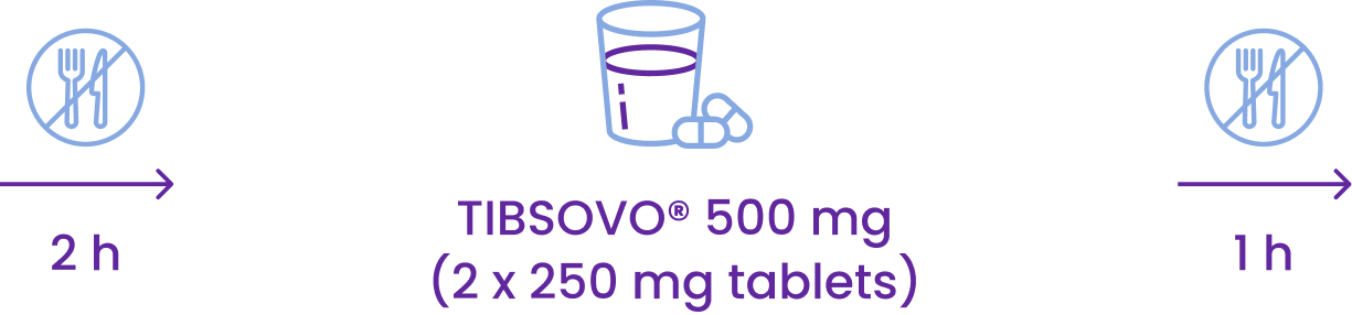 Do not eat anything for 2 hours before taking TIBSOVO® and until 1 hour after taking TIBSOVO®