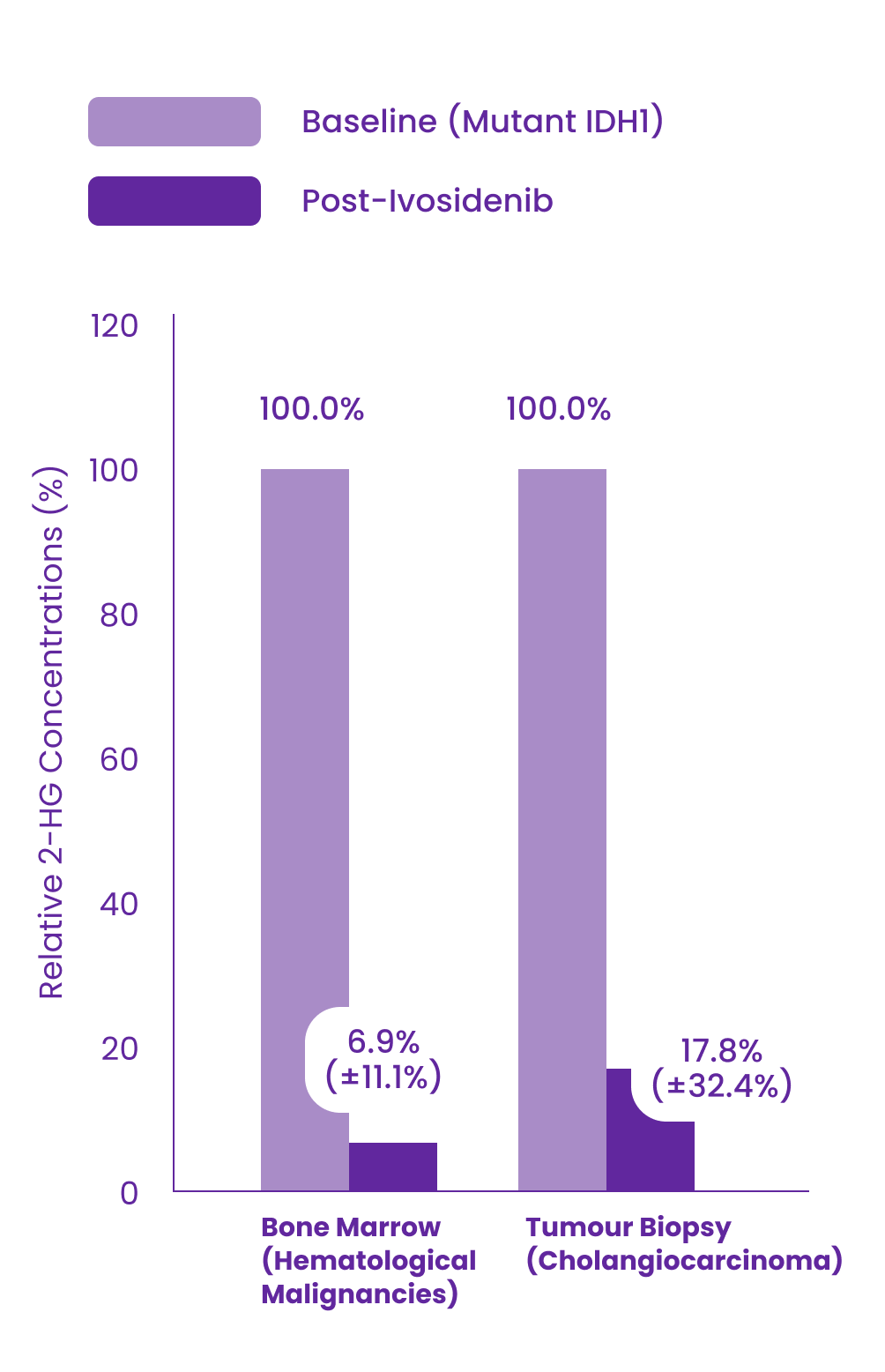 Multiple doses of ivosidenib 500 mg daily decreased plasma concentrations of 2-HG in patients with hematological malignancies and cholangiocarcinoma with mutated IDH1 to levels approximating those observed in healthy subjects. In bone marrow of patients with hematological malignancies and in tumour biopsy of patients with cholangiocarcinoma, the mean (% coefficient of variation) reductions in 2-HG concentrations were 93.1% (11.1%) and 82.2% (32.4%), respectively.