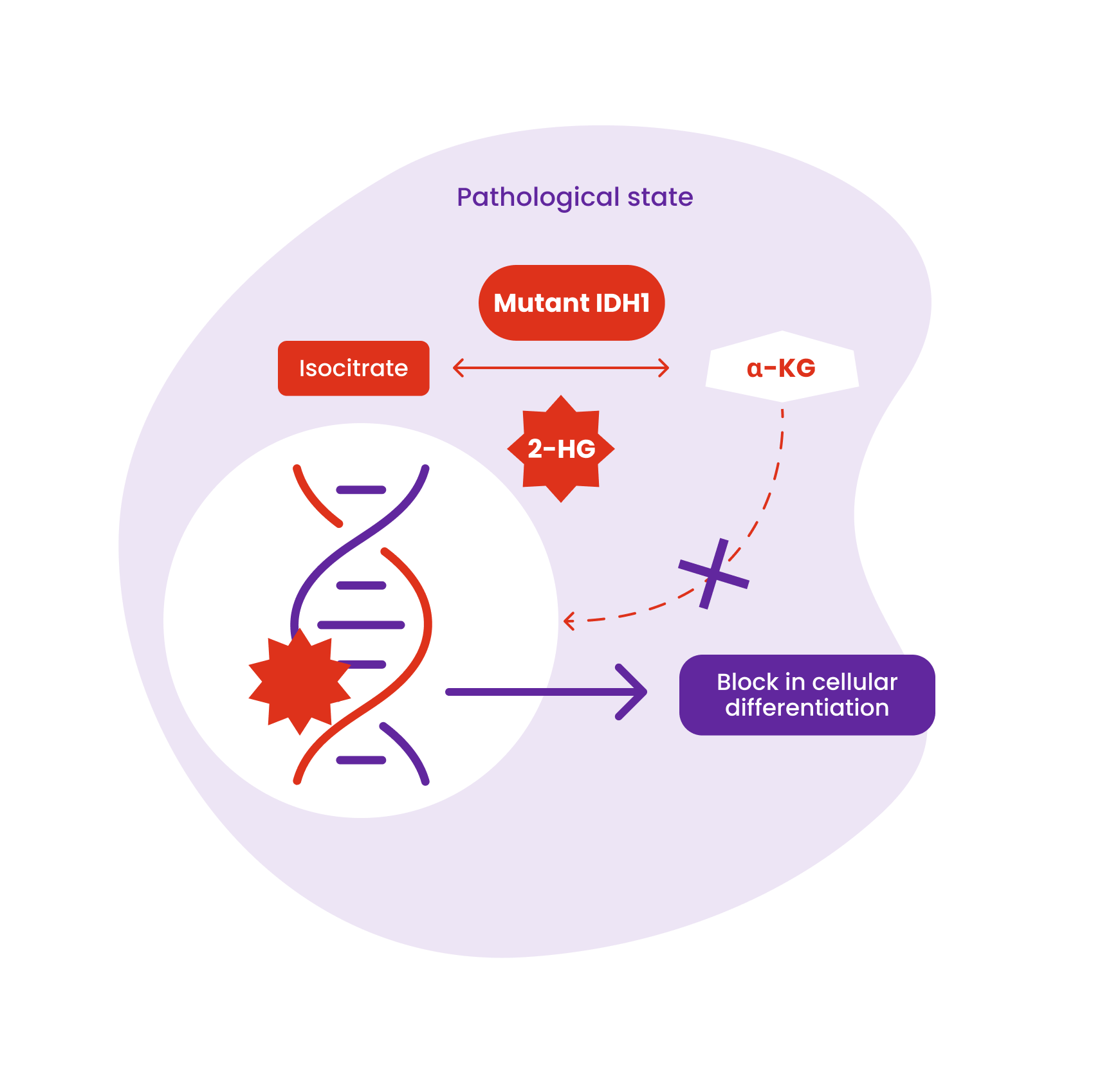 Mutant IDH1 converts alpha-ketoglutarate (α-KG) to 2-hydroxyglutarate (2-HG) which blocks cellular differentiation and promotes tumorigenesis in both hematologic and non-hematologic malignancies.