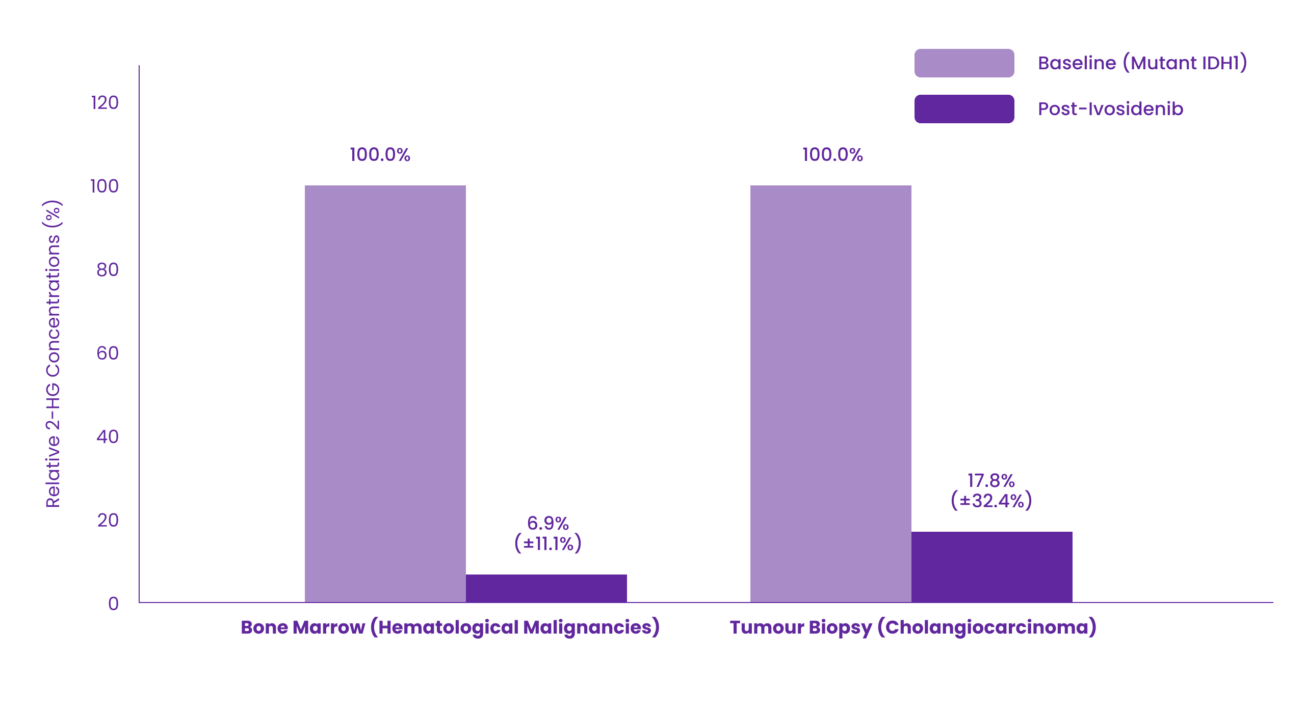 Multiple doses of ivosidenib 500 mg daily decreased plasma concentrations of 2-HG in patients with hematological malignancies and cholangiocarcinoma with mutated IDH1 to levels approximating those observed in healthy subjects. In bone marrow of patients with hematological malignancies and in tumour biopsy of patients with cholangiocarcinoma, the mean (% coefficient of variation) reductions in 2-HG concentrations were 93.1% (11.1%) and 82.2% (32.4%), respectively.