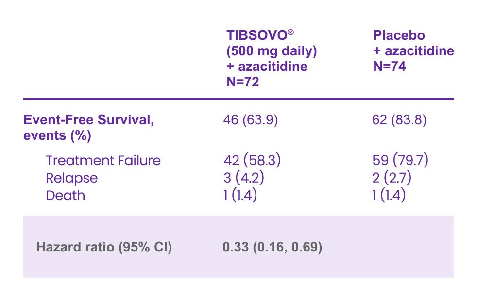 Event-free survival (EFS) was measured from the date of randomization until treatment failure, relapse from remission, or death by any cause. Hazard ratio is estimated using a Cox’s proportional hazards model stratified by the randomization stratification factors (AML status and geographic region) with placebo + azacitidine as the denominator. 1-sided p-value < 0.0017 was required to achieve statistical significance.