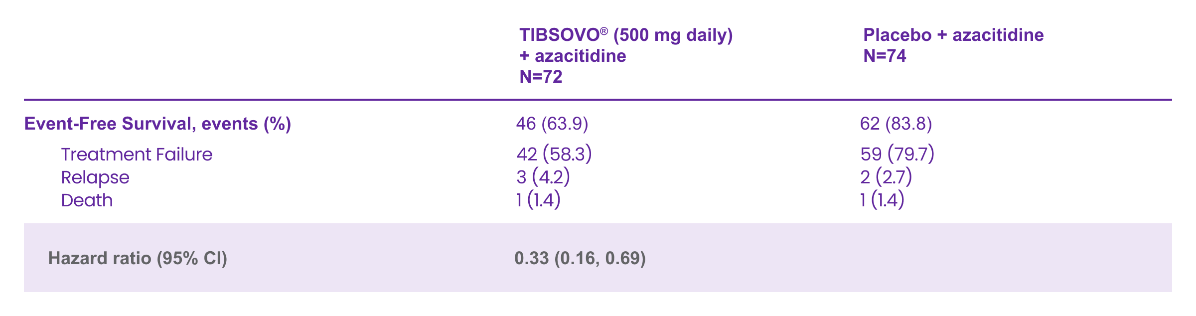 An updated OS analysis, carried out at 64.2% (N = 95) of events, confirmed the overall survival benefit of TIBSOVO® in combination with azacitidine compared to placebo in combination with azacitidine with a median OS of 29.3 months vs 7.9 months, respectively (HR = 0.42; 95% CI: 0.27 to 0.65).1